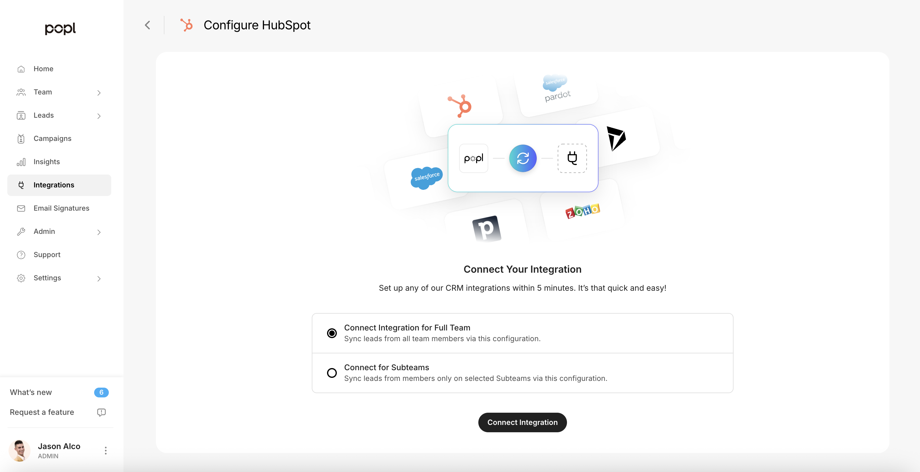 2. Next, you will be taken to the Connect Your Integration page as shown below. Choose if you want to connect this HubSpot connection for all members of the team, or just for certain Popl Subteams. (CRM connections can be unique per Subteam, see [Integration Types (Hierarchy) ](https://docs.popl.co/introduction/integrations/hubspot-integration/integration-types-hierarchy)for more details). Once you’ve made your selection, click on “Connect Integration”. \ <br>