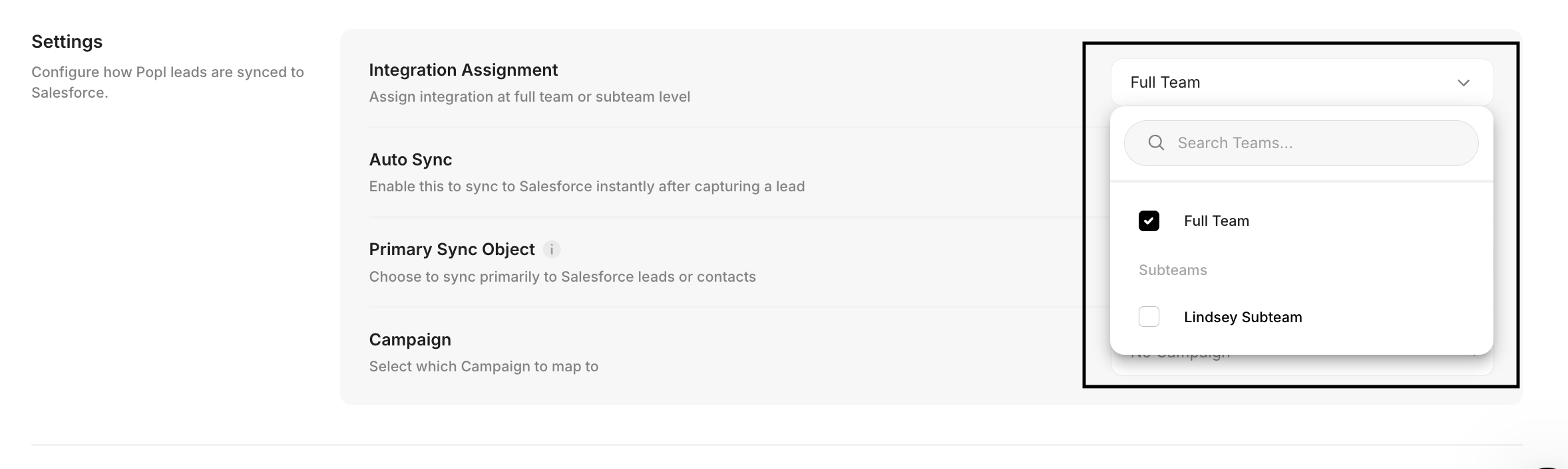 You can choose which team members this integration applies to. In this section, you can assign the integration to the **full team** or to a specific **subteam**, depending on how you want leads to sync into Salesforce.