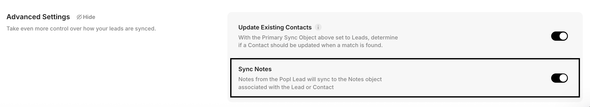 Have this setting toggled on to sync Popl notes to the Notes object in Salesforce