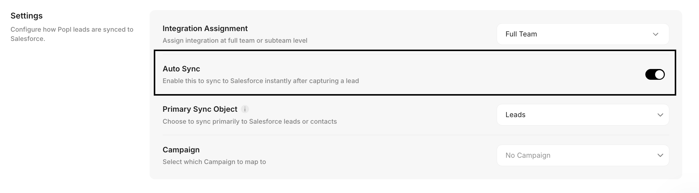 If you want this integration to automatically associate new Popl leads with a specific Salesforce Campaign, you can select the campaign in this settings section.