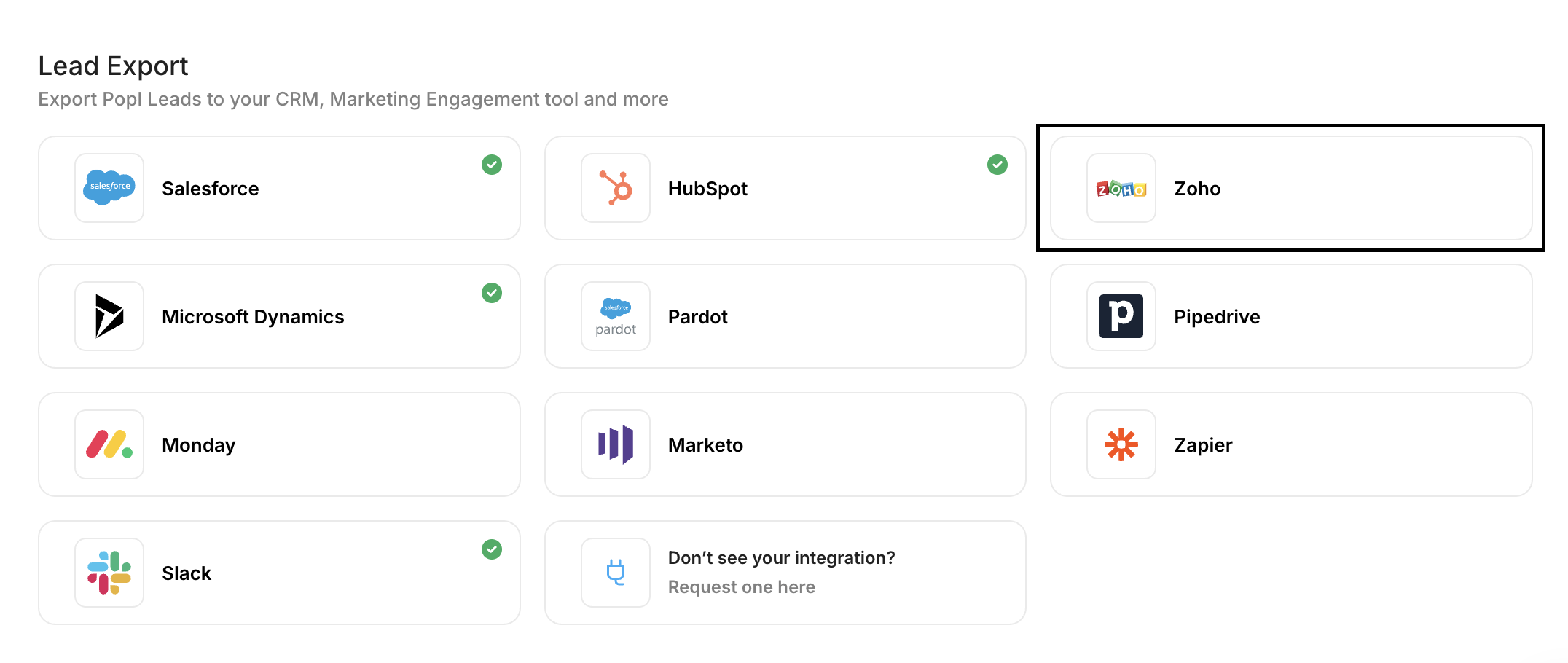 1. First, from the home page of the Popl dashboard, click into the "Integrations" tab. Then find the tile for Zoho and click on the tile.
